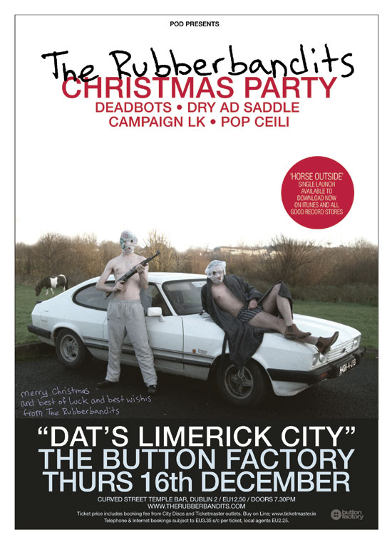 Here's the (admittedly poor, although the photo is classic) poster for the Rubberbandits single launch show in Dublin this week. Check out Horse Outside. And listen to the row on Ireland's main radio chat show.